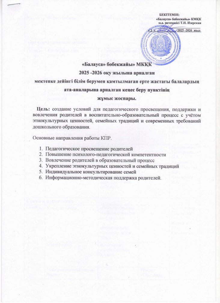 Мақсаты: этномәдени құндылықтарды, отбасылық дәстүрлерді және мектепке дейінгі білім берудің заманауи талаптарын ескере отырып, ата-аналарды тәрбиелеу-білім беру үдерісіне педагогикалық просвещение, қолдау және белсенді қатыстыру үшін жағдай жасау.